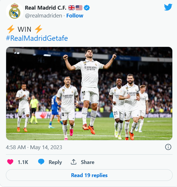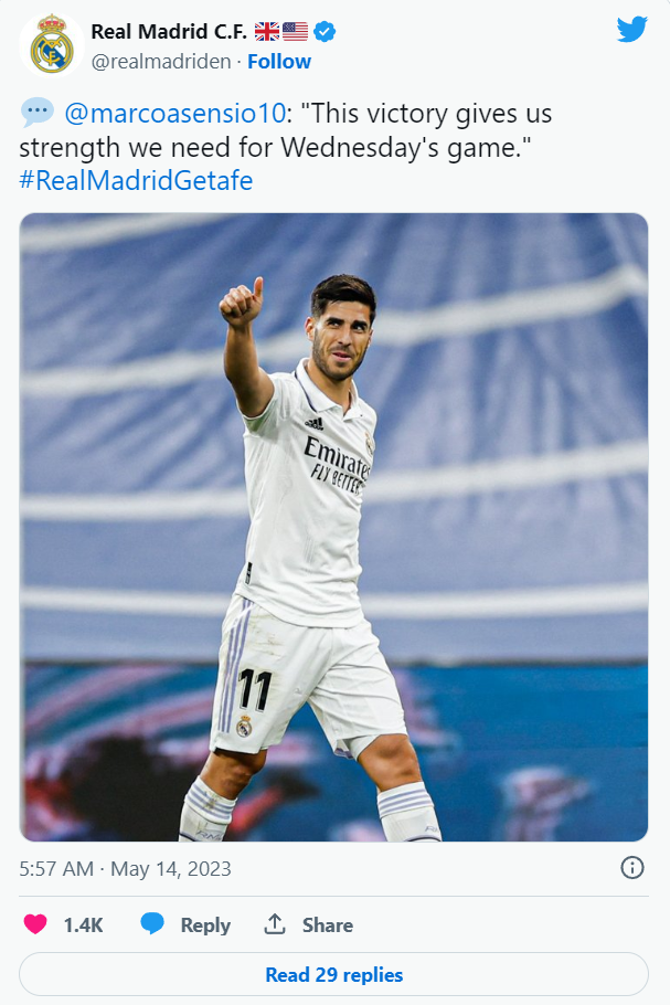 Courtois je z odlično obrambo preprečil Iglesiasu z razdalje, medtem ko je Getafe lovil točke, ki so ključne za njihovo upanje na preživetje. Vendar je Asensio poslal Madridčane v vodstvo 20 minut pred koncem, ko je njegov strel z 20 jardov odbil Nemanja Maksimović in mimo nemočnega Davida Sorie. “Poskušam izkoristiti priložnosti, ki mi jih daje trener,” je Asensio povedal za DAZN. “Vedeli smo, da bo to težka tekma proti ekipi, ki je močna v obrambi.” Asensio je skoraj podvojil svoj izkupiček z glavo po lepem predložku Kroosa, toda Soria je uspel z impresivno obrambo, da bi ga preprečil. Po porazu je Getafe Joseja Bordalasa ostal na 18. mestu v coni izpada, po točkah pa je izenačen s 17. Valencio, ki v nedeljo gostuje pri Celti Vigo.