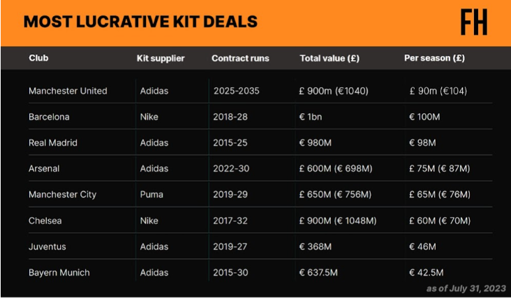 Nova pogodba za majice Manchester United x Adidas 2035 je vredna “vsaj” 900 milijonov funtov (90 milijonov funtov/sezono) in bo trajala 10 let, od 2025 do 2035. Nova pogodba naj bi trajala do leta 2035, s prejšnjo pogodbo dodano še desetletno podaljšanje.