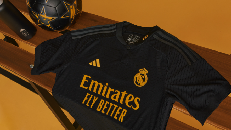 Za praznovanje ikoničnega grba kluba in nepozabnih nočnih predstav je adidas izdal tretji dres Real Madrida 23/24 s črno podlago, karbonsko obrobo in rumenimi poudarki.