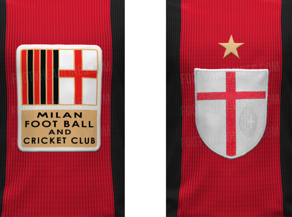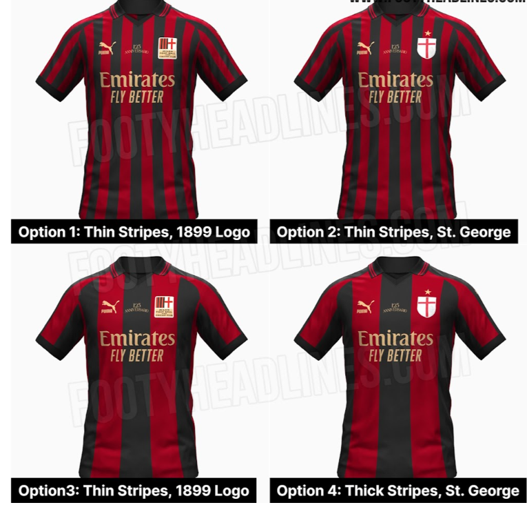Zaenkrat sta na voljo dve pomembni možnosti za Puma AC Milan 2024 125th Anniversary Jersey – tanke/debele črte in uporaba značk (1899 ali križ sv. Jurija).