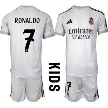 Tudi dojenčki so lahko male nogometne zvezde! Otroški Nogometni dresi Kompleti za otroke Cristiano Ronaldo 7, so tukaj. Čeprav je ozadje belo, nikoli ne izgleda dolgočasno. Dres Real Madrid 2025-2026 ima rumene črte, svetlo sivo obrobo in črn logotip. Rumene črte ob straneh, majhne sive črte na manšetah in ovratniku ter svetlo sive stranske stranice pod pazduhami so zelo vpadljive. Kupite enega za svojega otroka zdaj.