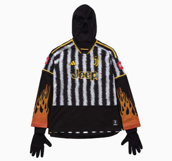 Na voljo je tudi različica domačega dresa 032c Nogometni dresi Juventus 23-24 posebne izdaje z dolgimi rokavi, v bistvu različica s kratkimi rokavi, prišita na črn pulover s kapuco z ognjenimi rokavi in rokavicami. Spodnja polovica te različice dresa je enobarvna črna.
