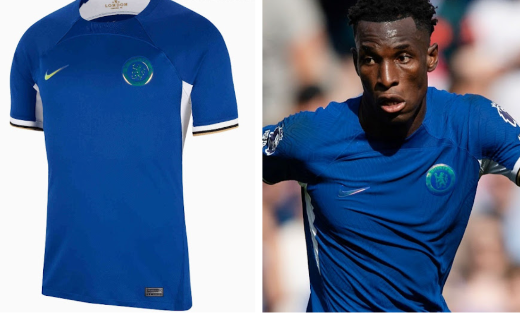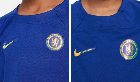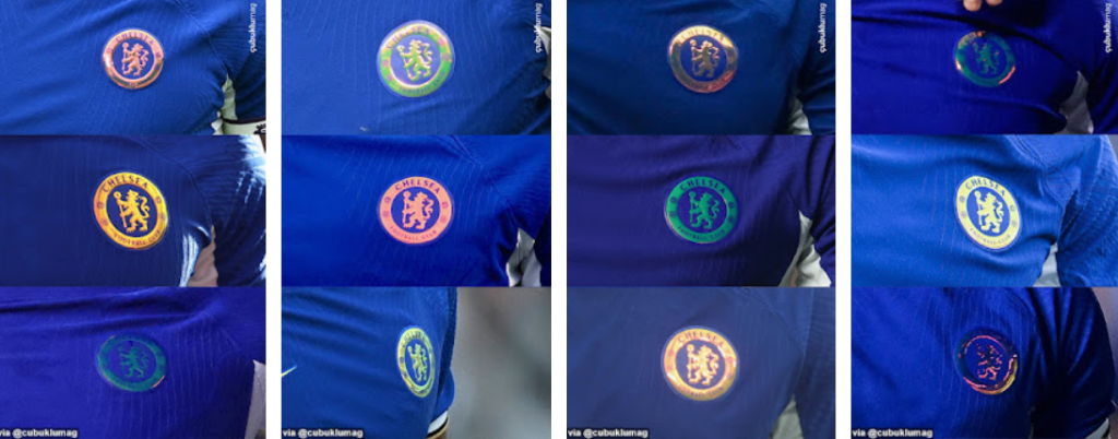 Chelseajev grb na domačem dresu Chelsea 23-24 ima poseben prelivajoč se učinek, zato je videti v različnih barvah, ko ga gledamo iz različnih zornih kotov.
