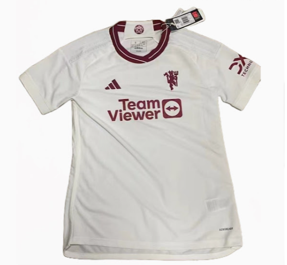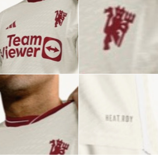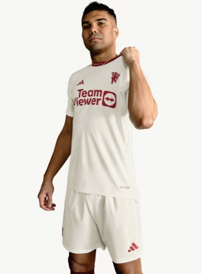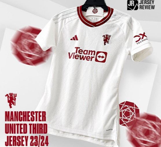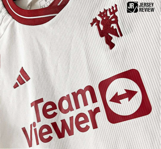 . Tri črte so v enem tonu, kar omogoča, da ovratnik in značka izstopata na tretjem dresu Manchester Uniteda 2023–2024.