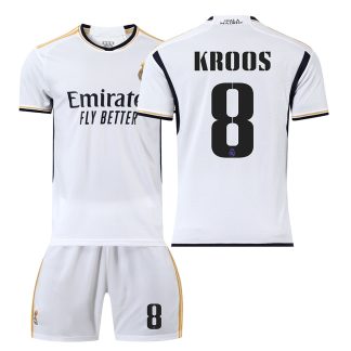 Domači dresi Real Madrid so tradicionalno beli. Bela simbolizira čistost, plemenitost in eleganco, kar odmeva kraljevski naziv kluba. Ta preprosta in klasična bela oblika je zelo privlačna za oči na igrišču, zaradi česar igralci med igro sijejo kot svetleče zvezde. Ovratnik in manšete imajo običajno nekaj izvrstnih modelov, kot so barvite črte ali okraski z vzorci, ki dresu dodajo občutek mode in edinstvenosti. Emblem ekipe se nahaja na sredini prsnega koša dresa, besede Real Madrid pa poudarjajo plemenit status kluba.