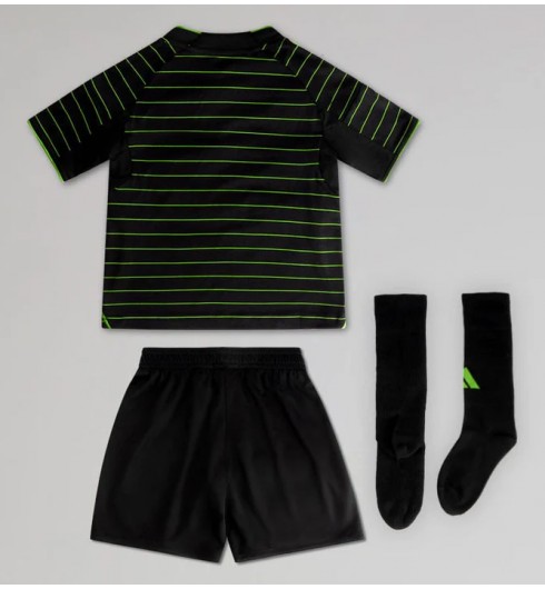 Otroški dres Boston Celtics za sezono 2025-26 v gosteh ima črno podlago s tankimi fluorescentno zelenimi vodoravnimi črtami in ujemajočimi se zelenimi detajli na ramenih, ovratniku in šivih. Grb in logotip kluba Celtics sta natisnjena v isti barvi na prsih, skupaj z logotipom sponzorja na sredini.