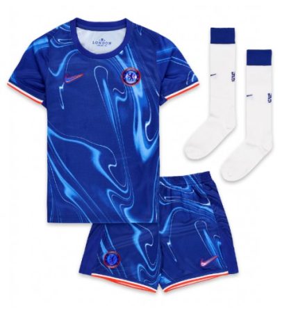 dresi kompleti za otroke Chelsea Domači 2024-25 ima gorečo modro barvo. Dres Chelsea združuje tradicionalno modro in oranžno belo, z edinstveno oranžno in belo, ki se pojavljata na rokavih, logotip dresa Chelsea pa je svetlo moder in obrobljen z “oranžno ekipno značko”. Modri vrtinčni vzorec predstavlja najbolj vroč del plamena in igralčevo gorečo strast do uspeha. Oranžna barva simbolizira njihovo živahno energijo in potencial.