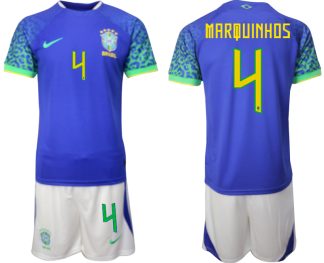 Moški Nogometni dresi Brazilija Gostujoči SP 2022 Kratek Rokav + Kratke hlače MARQUINHOS 4