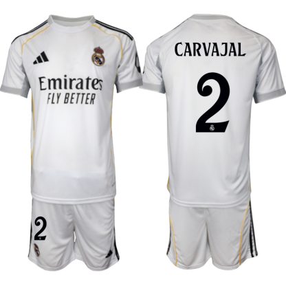 Moški Nogometni Dresi kompleti Real Madrid Domači 2025-26, so tukaj. Čeprav je ozadje belo, nikoli ne izgleda dolgočasno. Novi Dres Real Madrid 2025-2026 ima rumene črte, svetlo sivo obrobo in črn logotip. Rumene črte ob straneh, majhne sive črte na manšetah in ovratniku ter svetlo sive stranske stranice pod pazduhami so zelo vpadljive.
