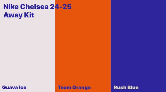 Uradno so barve gostujočega dresa Nike Chelsea 24-25 “Guava Ice/Team Orange/Sprint Blue”. “Rush Blue” in “Team Orange” sta uporabljena tudi na domačem dresu.