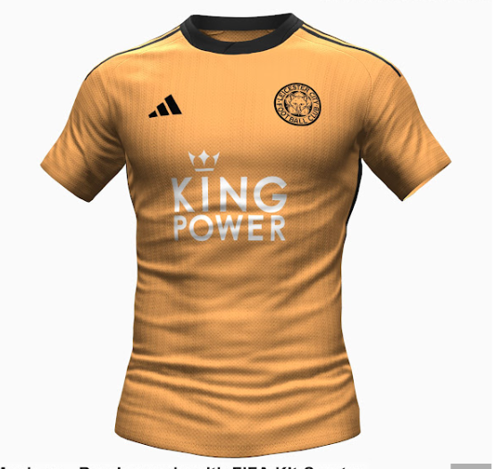 Grb Leicester Cityja na levem prsnem košu gostujočega dresa Adidas Leicester sezone 2023-24 je enobarven oranžen. Sponzor dresa King Power Group je bel in se nahaja na sredini sprednje strani.