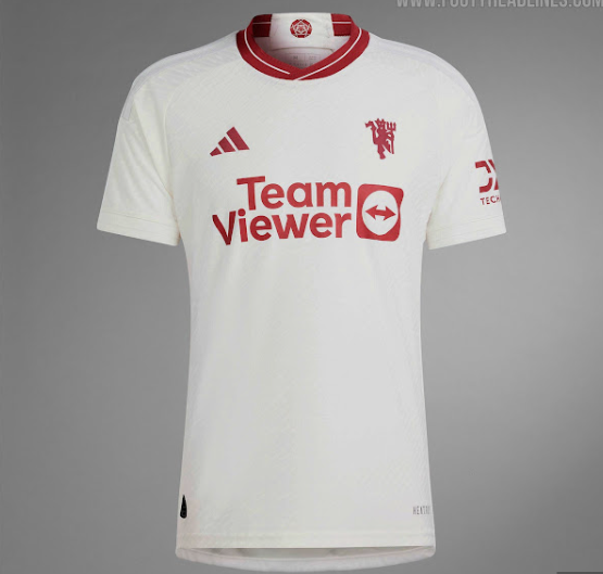 Tretji gostujoči dres Adidas Manchester Uniteda 2023–2024 je večinoma umazano bel z rdečimi poudarki.